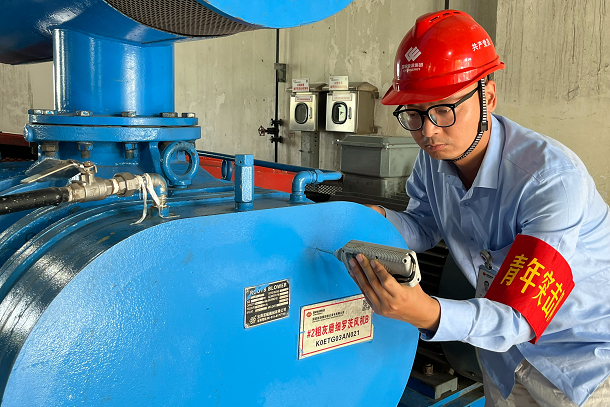 圖為青年人員檢查粗灰磨制系統(tǒng)設(shè)備運行情況