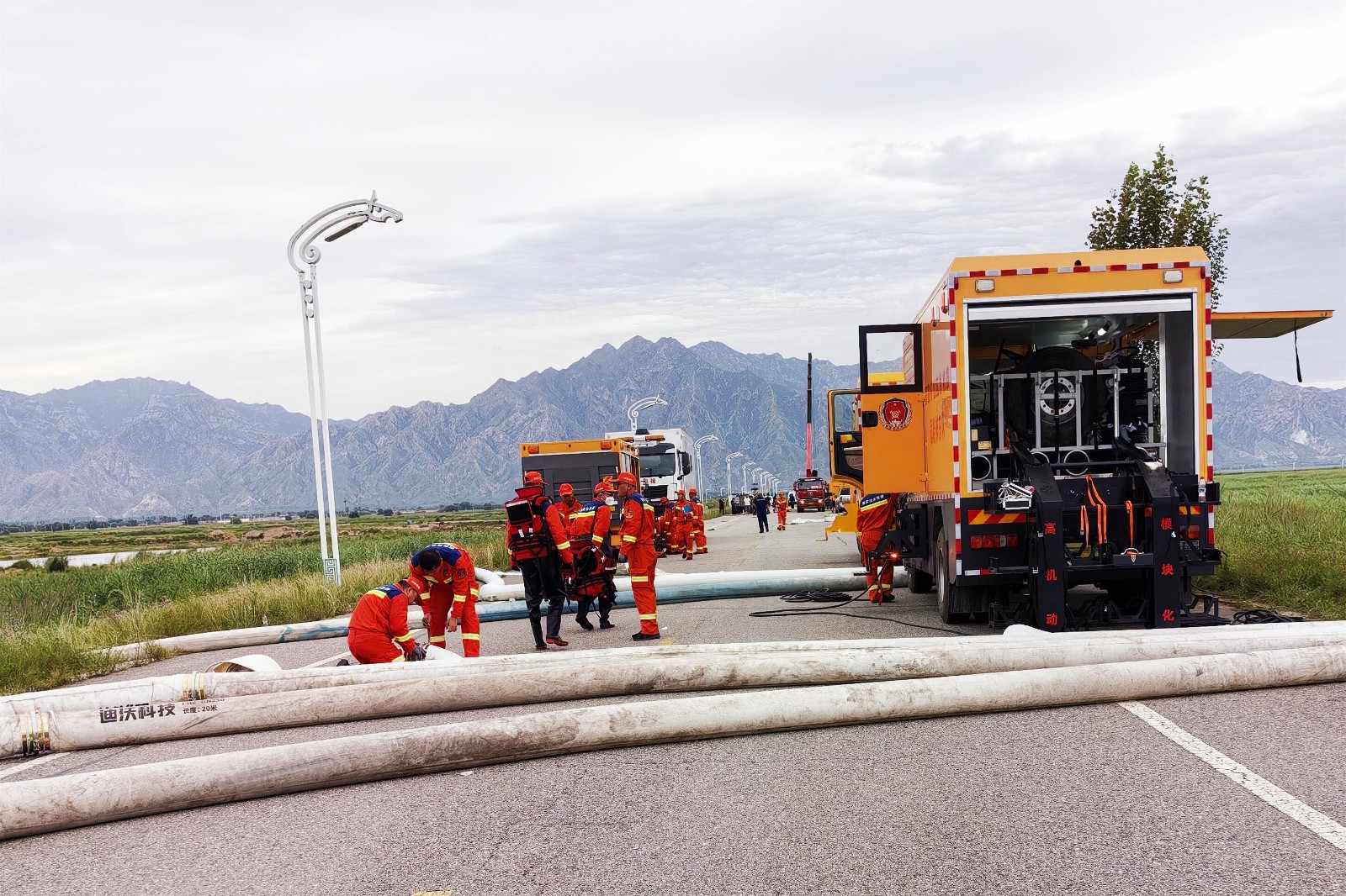 庫(kù)房里,兩輛大流量排水搶險(xiǎn)車(chē)被迅速喚醒,經(jīng)過(guò)細(xì)致檢查,整裝待發(fā)。8月7日9時(shí)30分,指揮車(chē)、宿營(yíng)車(chē)、裝備運(yùn)輸車(chē)連同兩輛大功率排澇車(chē)等7輛車(chē)22人集結(jié)完畢,承載著下游村莊沉甸甸的希望,沖破重重雨幕,向著200多公里外的土默特左旗哈素?,F(xiàn)場(chǎng)疾馳而去。
