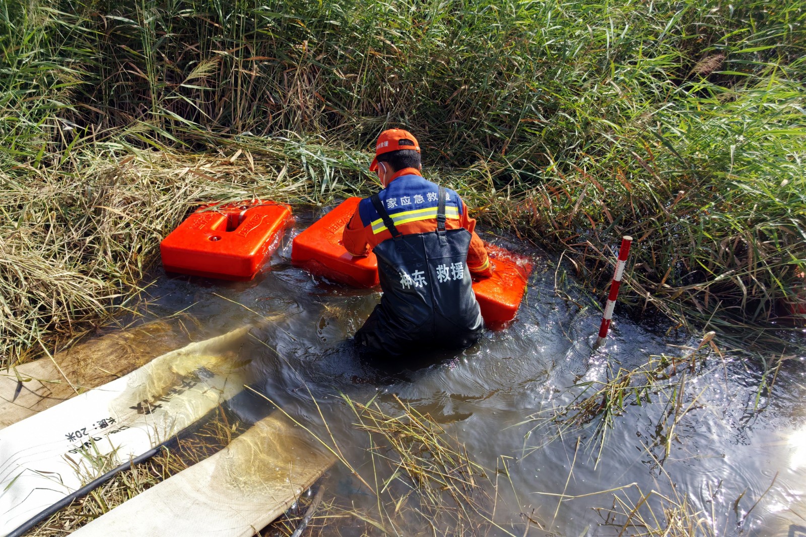 圖為救護(hù)隊(duì)員到達(dá)現(xiàn)場(chǎng)連接排水管路