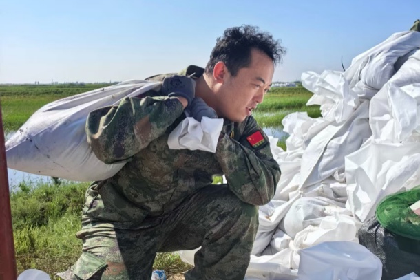 連續(xù)多日,每當(dāng)累到岔氣時(shí),王旭就捂著腰弓會(huì)兒身,喘兩口粗氣又接著扛,心里只有一個(gè)念頭:“多出一份力,堤壩就多一分安全”。