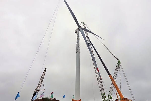 圖為岷縣二期首臺(tái)風(fēng)機(jī)吊裝完成